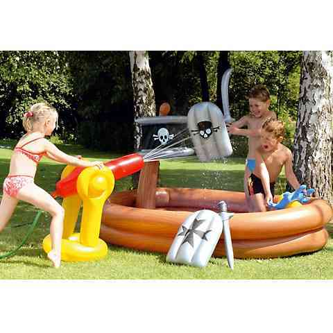 Itt az ideje a tengeri szórakozásnak! A kalózhajó alakú medencében igazi szórakozás vár, hiszen bármikor megtámadhatnak! A kerti locsolóra csatlakoztatható vízágyúval bármikor védekezésre kényszeríthetnek. Azonban nem kell félned, hiszen megvan minden harci eszközöd a hajóban! Kardok és pajzsok, állnak rendelkezésedre, valamint egy távcső is, hogy messziről kiszúrhasd az ellenséget! Igazi német minőség, strapabíró és környezetbarát anyagból!