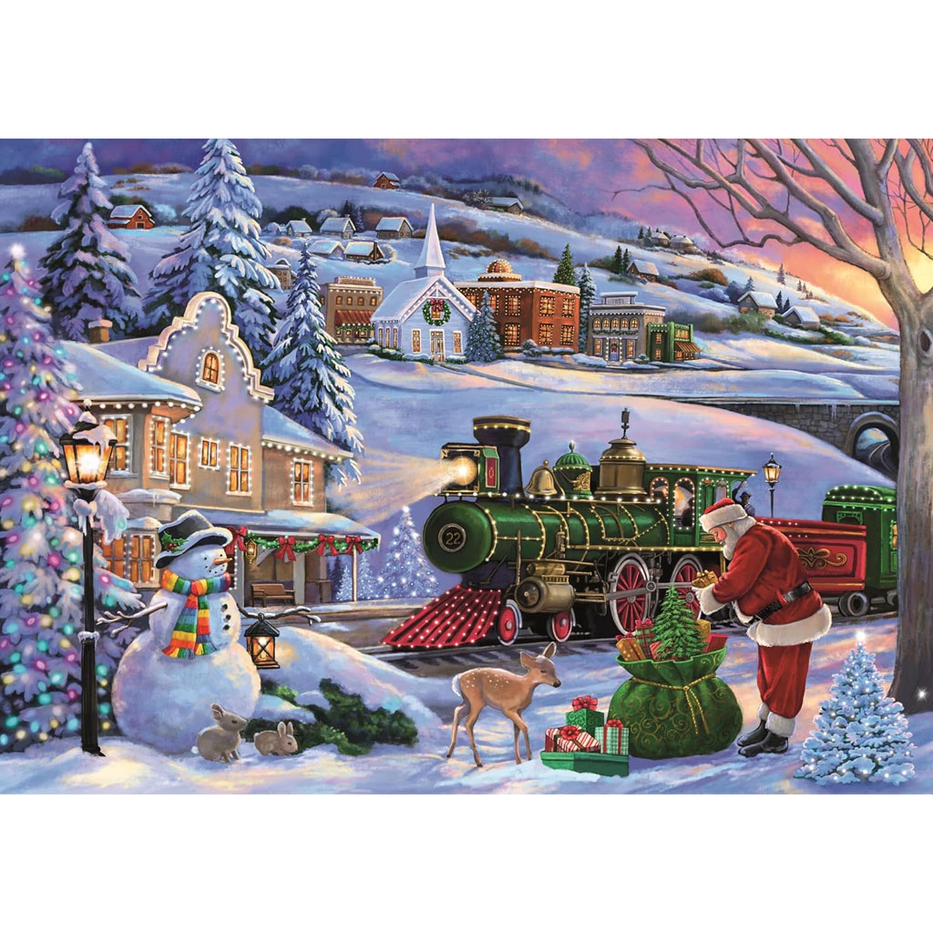 A Clementoni Karácsonyi vonat 500 darabos puzzle tökéletes választás, hogy ráhangolódj a karácsonyi ünnepekre. Ez a gyönyörű, klasszikus karácsonyi jelenetet ábrázoló puzzle egy téli tájat mutat be, ahol egy zöld gőzmozdony indul el ajándékokkal megrakodva, miközben a Mikulás gondosan elhelyez egy kis karácsonyfát. A háttérben hóval borított házak, ünnepi fények és egy békés kisváros élete elevenedik meg, tele karácsonyi hangulattal. A részletgazdag kép megidézi a régi idők karácsonyainak varázsát, miközben a hóember és a játszadozó állatok még több bájt kölcsönöznek a jelenetnek.