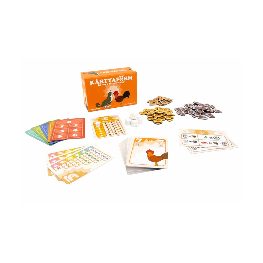 A Kártyafarm társasjáték egy igazán különleges, ütésvivős kártyajáték, ahol a farm állatai nem csak hangosak, hanem ravaszak is. Itt nem elég egyszerűen megnyerni a köröket: előre meg kell jósolnod, pontosan hány ütést fogsz elvinni, és a játék végén csak akkor jár a jutalom, ha ezt maradéktalanul teljesíted. A farmon minden állat verseng a hatalomért – a kotkodácsoló tyúkok, a bőgő tehenek és a makacs kecskék mind bevetésre készek. A játék elején látod, milyen színű lapok kerülnek játékba, de az értékek titokban maradnak, így minden vállalás kockázatos döntés. A lapkijátszás során követned kell a hívott színt, de ha nincs megfelelő lapod, bármelyik állatot bedobhatod. Az ütést általában a legnagyobb érték viszi, ám az azonos számok kioltják egymást, így akár egy kisebb lap is váratlan győzelmet arathat. A forduló végén csak az kap pontot, aki pontosan annyi ütést szerzett, amennyit vállalt – minden eltérés mínusz pontot ér. Hat fordulón át zajlik a küzdelem, a végén pedig kiderül, ki lesz a farm királya. Gyorsan tanulható, mégis taktikus játék, amely családi és baráti társaságban is garantált szórakozást nyújt.