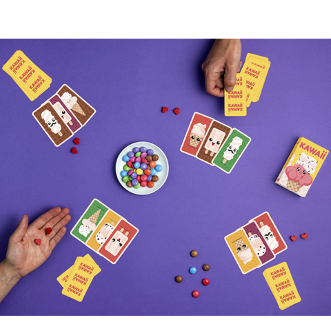 Tuti, hogy nincs olyan gyerek aki ne szeretné a finom és hűsítő fagylaltot, és a legtöbbjüknek van kedvenc íze és talán formája is. A Kawaii játék lényegét pont ezek a dolgok adják, hiszen a játék során a cél nem más, minthogy minél többet gyűjtsenek a kedvenc jégkrémükből. A feladat könnyűnek tűnik, de a dolgot megbonyolíthatja, ha a kedvenc fagylaltárú épp zárva van. Tehát, a cél a lehető legtöbb jégkrém begyűjtése, de vannak fontos szempontok is. Mert valamit az íze, valamit pedig a különleges formája miatt érdemes megszerezni. A cseresznye és a bezárt bolt lapok speciálisak, mivel míg előbbivel értékes pontokat nyerhetsz, addig utóbbival ezeket el is veszítheted. A Kawaii jó memóriát és megfigyelőképességet igénylő játék, amely biztosan a gyerekek kedvencévé válik! A megfelelő formájú és ízű fagyik begyűjtésével pontokat lehet szerezni, 3 kör után pedig, az nyer aki a legtöbb pontot gyűjti össze.