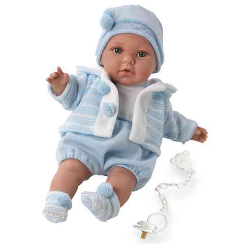 A kisfiú baba ruházata a kék és fehér színek kombinációjára épül. Mintázatának egyszerűsége teszi ízlésessé ezt a játékot. Öltözéke hurkolt anyagból készült, ami lehetővé teszi az egyszerű tisztítást. A játékbaba öltöztethető. Ruházata pom-pomos, kék-fehér csíkos, kapucnis kardigánból, szintén csíkos zokniból, pom-pommal díszített sapkából és rugdalózóból áll.