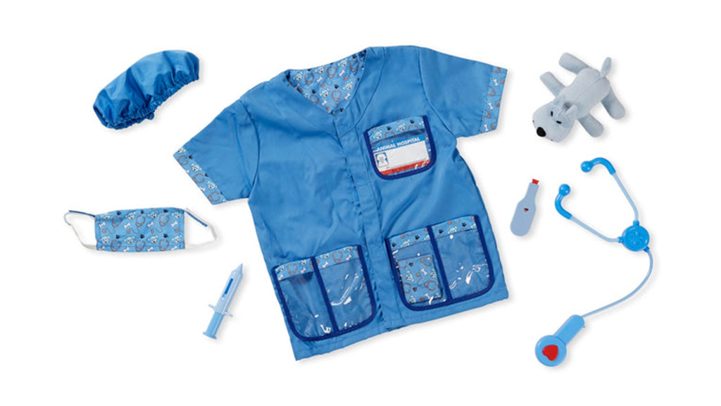 A kicsik képzeletbeli játék során gondoskodhatnak a képzeletbeli háziállataikról és a plüssállataikról. A készlet tartalmaz egy kabátot, maszkot, sapkát, hőmérőt, sztetoszkópot hanghatásokkal, kötést, fecskendőt, plüsskutyát és egy újrahasználható névtáblát. Ezen kívül a gyerekek megtanulhatják az állatorvosi eszközök használatát, és fejleszthetik szociális készségeiket és empátiájukat a játék során.