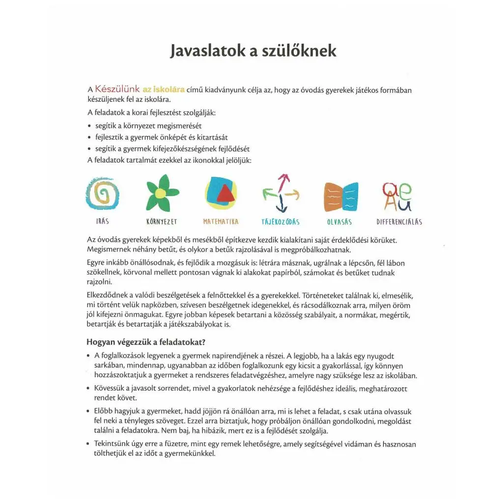 A szülők számára a kiadvány hasznos tanácsokat nyújt, hogyan integrálhatják ezeket a gyakorlatokat a gyerekek mindennapi rutinjába. A feladatok fokozatosan nehezednek, hogy lépésről lépésre vezessék be a gyerekeket az iskolai követelmények világába. Ezáltal a gyermekek magabiztosan és felkészülten kezdhetik meg iskolai pályafutásukat.
