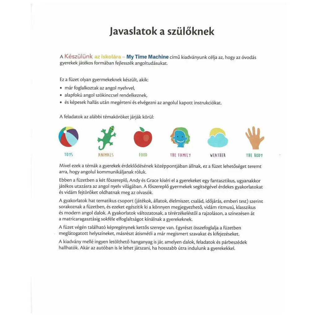 A kiadványhoz ingyenesen letölthető hanganyag is jár, amely dalok, feladatok és párbeszédek formájában segíti a gyerekeket az angol nyelv hallás utáni megértésében és használatában. Ezáltal a gyerekek könnyedén elsajátíthatják az új szavakat és kifejezéseket, és magabiztosabban használhatják az angolt a mindennapi életben.