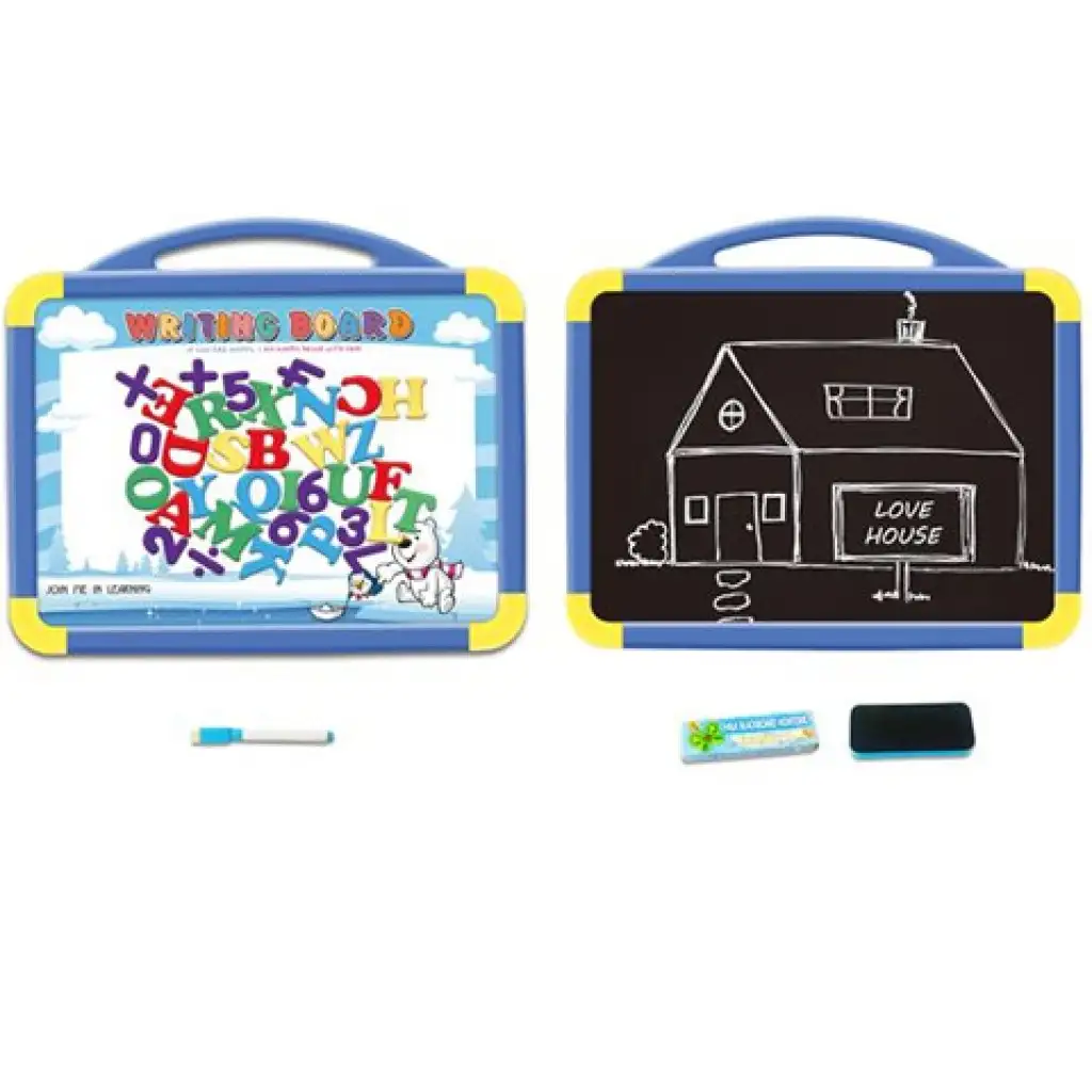 Egy remek készségfejlesztő szerezhetsz be gyermekednek, mely biztosan elnyeri majd tetszését. A rajztábla ugyanis kétoldalú kialakítást kapott, melynek egyik fele fehér táblás, amire táblafilccel lehet írni és rajzolni, valamint mágneses is, a másik fele pedig fekete, amire krétával lehet írni. Ehhez egy kréta csomag és egy törlőszivacs is a szett része, valamint a másik oldalhoz egy táblafilc is, szivaccsal a végén. Ezen kívül még egy mágneses betű és szám szett is a cosmag része, melyek segítenek megismerkedni ezekkel.