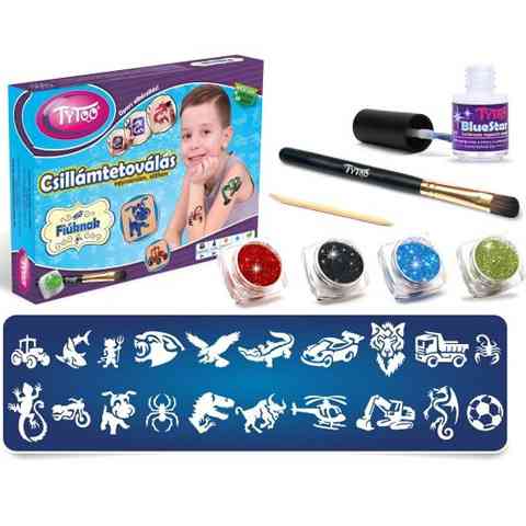 Irigyled a lányok mutatós csillám tetoválásait, csak éppen te vagányabb mintákra vágysz? Ebben a dobozban nem fogsz csalódni, hiszen húsz igazán fiús mintát találsz a cápától a focilabdán keresztül a járművekig, amelyeket négy különféle csillámor felhasználásával alkothatsz meg gyorsan és egyszerűen. A készlet tartalmazza a szükséges ragasztót, ami természetesen menetes minden káros és allergén anyagtól és akár tizennyolc napig tartó tetoválást elkészítését is lehetővé teszi. A dobozban három különböző színű kozmetikai csillámpor is helyet kapott, a minták színvilágához igazodva.