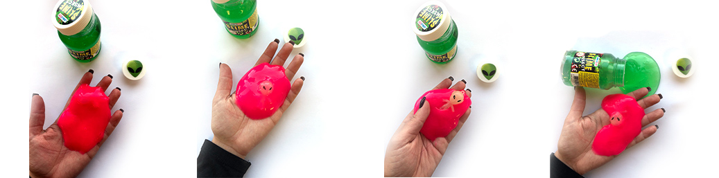 A másik egy élénk rózsaszínű már kicsit sűrűbb Slime, amiben egy icipici idegen lény rejtőzött el. Ennek az anyaga is először nedvesnek érződik, de mégis száraznak tűnik. Ezek a Slime termékek még a felnőtteket is hosszú időre lekötik, hát még a gyermekeket.