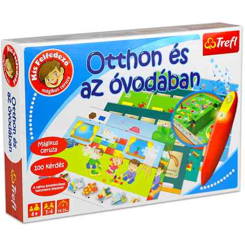 Minden bizonnyal az otthonodban és az óvodában töltöd a legtöbb idődet, ez a két hely amit a legjobban ismerhetsz. Az oktató-fejlesztő társasjáték segítségével többet tudhatsz meg az otthonodban található tárgyakról használati eszközökről és konyhai kiegészítőkről, valamit az óvodában található játékokról és egyéb használati tárgyakról. Az érdekfeszítő játék segítségével most felfedezheted a környezeted. A játékot akár egyedül, de maximum 4-en játszhatjátok. A játék során a készségfejlesztés is előtérbe kerül, megismerkedhetsz a betűkkel, szavakkal, színekkel és formákkal. Fejleszd logikus gondolkodásod, használd a varázstollat a feladatok megoldásához és ismerkedj meg a környezetedben található dolgokkal.