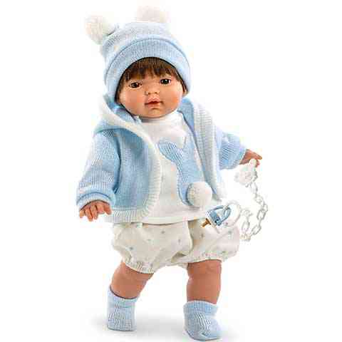 A tündéri kisfiú baba egy szempillantás alatt le fog venni a lábadról. A spanyol gyártó, Llorens méltán híres csodaszép, részletgazdag kidolgozású babáiról, mely alól ez a termék sem kivétel. A bájos tekintetű fiú baba finom tapintású barna hajat kapott, kötött nyuszis ruhácskája pedig gondoskodik arról, hogy a kicsi ne fázzon meg, ha sétára indul anyukájával. A pasztell kék árnyalatú sapka, és a meleg, kötött kabátka díszéül szolgálnak a hatalmas fehér bojtok, melyek feldobják a baba megjelenését. A macis cumi mindig nála lesz, mely láncos, ruhára csíptethető kivitelének köszönhetően nem fogja azt a gyerkőc elhagyni.