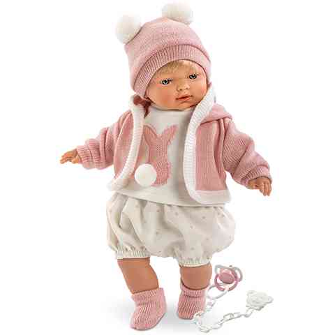 A Llorens babák méltán híresek részletgazdagon kidolgozott, élethű arckifejezésükről, és bájos vonásaikról. A szőke fürtös kislány baba pasztell rózsaszín, és tört fehér árnyalatokban pompázó ruhácskája középpontjában a nyuszi minta áll, melyre még egy bojtot is tettek a tervezők, ami a kötött sapkán is visszaköszön. A vidám ruhácska mellett a macis cumi is a szett része, melyet rá lehet csíptetni a baba kardigánjának a szélére, így azt még a séta közben sem fogjátok elhagyni.