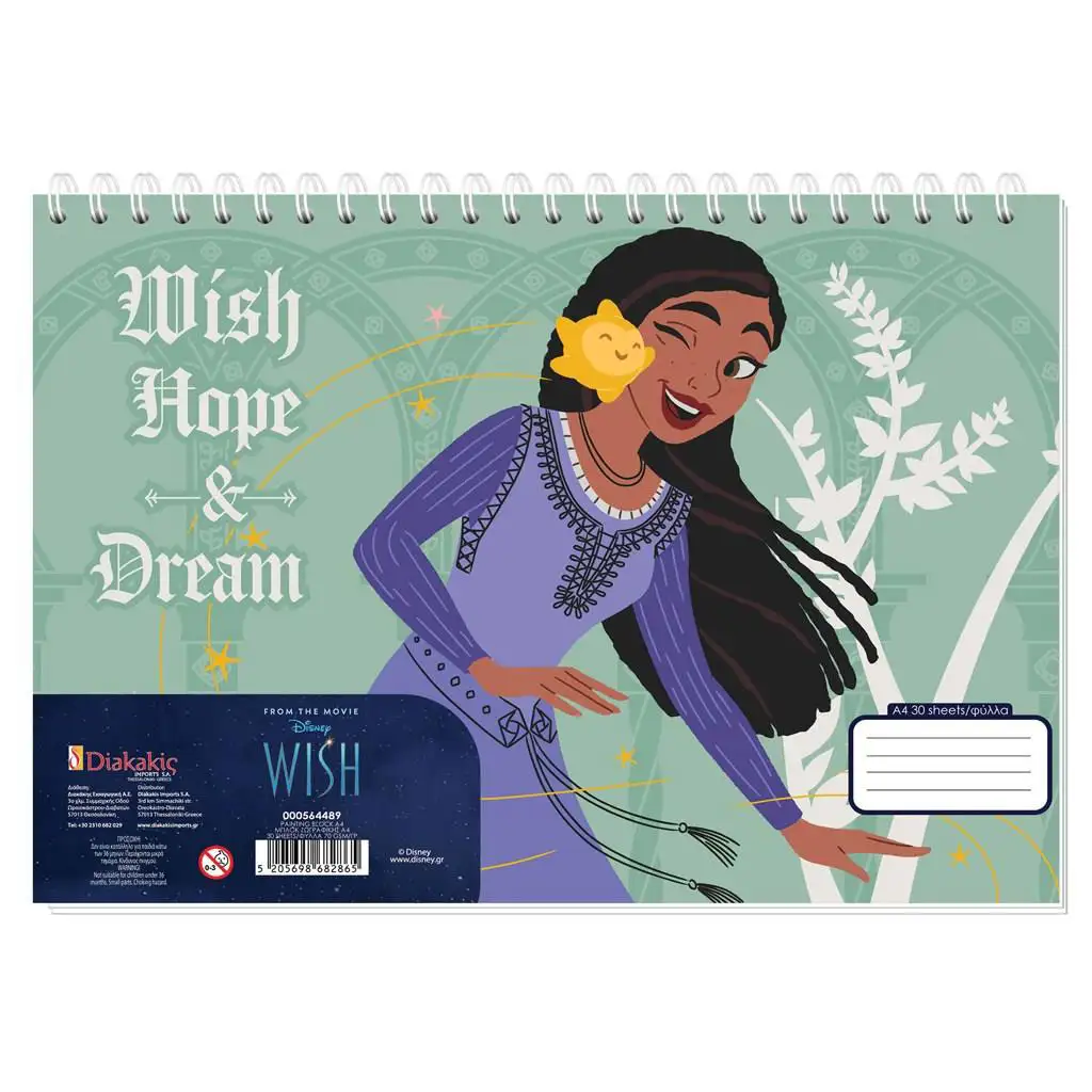 A Disney Kívánság vázlatfüzet tökéletes választás minden kis művész számára, aki szereti a varázslatos meséket és kalandokat. Kétféle változatban érhető el, mindkettő elbűvölő grafikákkal, amelyek a Disney Kívánság című film világába repítenek. Az első változaton egy gyönyörű hercegnő látható, aki a csillogó kastély előtt ül, és egy aranyos, mosolygós csillag társa kíséri. Ez a jelenet inspirálja a gyerekeket, hogy ragyogjanak és kifejezzék kreativitásukat. A második változaton a "Wish, Hope & Dream" üzenet áll, amely arra ösztönzi a kicsiket, hogy álmodjanak nagyot és higgyenek a csodákban. A borítón szereplő főszereplő boldogan integet, miközben a csillag barátja mellette lebeg, sugallva a reményt és a varázslatot.