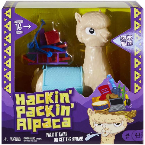 Ebben a társasjátékban nem lesz szükség dobókockára, sem, játéktáblára, nem kell kártyákat húzni és kijátszani azokat, mégis elképesztően izgalmas és biztosak lehetünk benne, hogy nagy sikert fog aratni a gyerekek körében. Mindenek előtt fel kell tölteni az Alpakát vízzel, aztán azzal kezdődik a játék, hogy meg kell nyomni az alpaka fejér, majd el kell rajta helyezni a tizenhat különféle tárgyat. Ahhoz, hogy minden tárgy az alpakára kerüljön nem elég ügyesnek lenni, hiszen ha túl sokáig tart a dolog, a türelmetlen állat vizet köp a játékosra. Ez a játék garantálja a nevetést és a szórakoztató időtöltést!