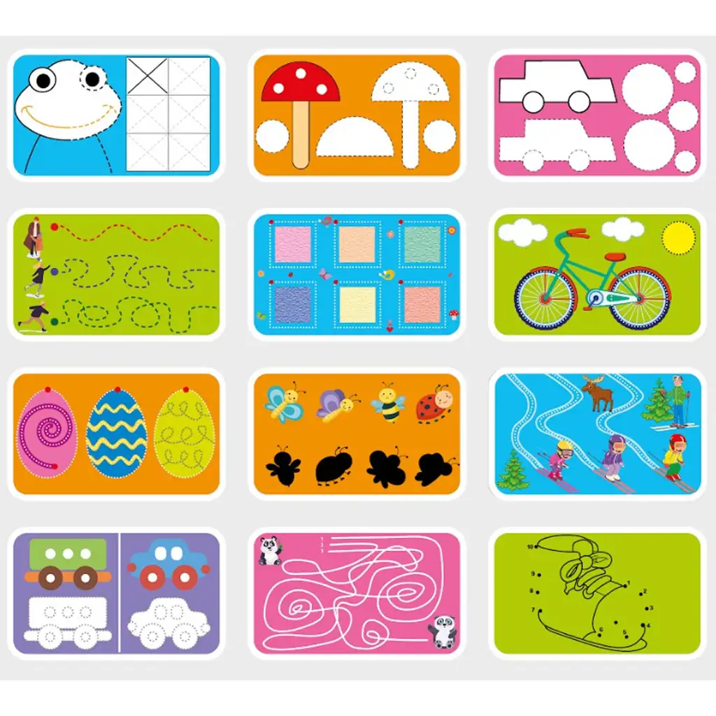 A csomag 12 kétoldalas kártyát tartalmaz, amelyek különböző típusú feladatokat kínálnak, például útvesztők, formák összekötése, vonalvezetési gyakorlatok és árnyképek azonosítása. A kártyák letörölhetőek, így a mellékelt filccel a feladatok újra és újra megoldhatók, ami lehetővé teszi a folyamatos gyakorlást és tanulást. A feladatok egyszerűek, mégis izgalmasak, és pontosan illeszkednek a kisgyerekek életkori sajátosságaihoz.