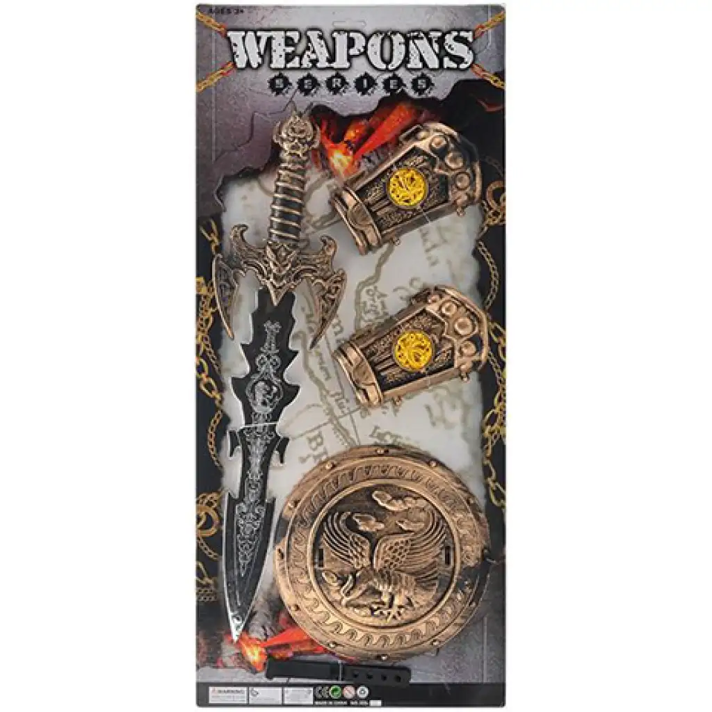 Ebben a 4db-os középkori harcos felszerelés készletben egy kardot, egy pajzsot és 2db standard méretű kézfej védőt találhatsz amelyeket gyermeked felölthet magára és egy szempillantás alatt egy vérbeli középkori katona bőrébe bújhat. A középkor izgalmas történetei megmozgatják a gyermekek fantáziáját amely készségfejlesztő hatással bír és mozgásra ösztönöz. A szettben található kiegészítők strapabíró műanyagból készültek, amely hosszútávú használatot eredményezhet. A hajlékony műanyagból készült kard veszélytelen használatot eredményez, így akár már három éves kortól használatba veheti gyermeked újdonsült középkori felszerelését.