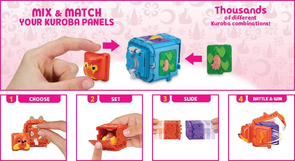 Minden egyes harcost tökéletesen kombinálhatsz egymással, amellyel további képességekre tehetsz szert. A Kurobák nem véletlenül kocka alakúak, hiszen az összecsapás pillanatában az erősebb fél egyszerűen bekebelezi a másikat és ezzel megnyeri a menetet, majd később akár a viadalt is! Állítsd be a hátán található apró pöcök segítségével, hogy kővel, papírral, vagy ollóval indulsz a csatába és már kezdődhet is az összecsapás! Az a Kuroba, aki megnyeri a küzdelmet egy szempillantás alatt bekebelezi ellenfelét.