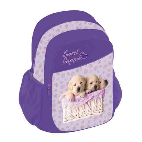 Ennek a kiskutyás hátizsáknak a mintája elvarázsol bárkit, főleg az állatokat, kutyákat szerető kislányokat. A hátizsák könnyen tisztítható, így a szülők kedvence is. A hátizsák egy nagyobb rekeszből és egy kisebb rekeszből áll, melyek cipzárral záródnak. A hátizsák két oldalán két kisebb zseb is van, melyek gumírozottak, így biztonságosan tárolható benne bármi.