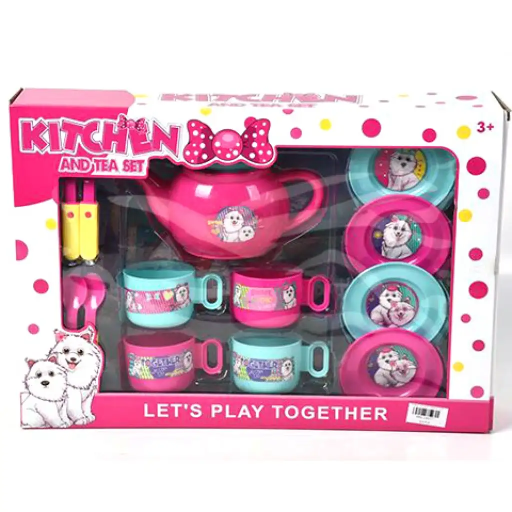 A kislányok most egy igazán mutatós teáskészlettel vendégelhetik meg a barátnőiket vagy a szervezhetnek a babák számára egy szórakoztató teadélutánt. Ebben a csomagban egy négy személyes teás készlet kapott helyet, bögrékkel, csészealjakkal, kannával és persze kanalakkal. A készletet ráadásul pink és türkiz alapszínek mellett nagyon cuki kutyusos képek díszítenek, így egészen biztos, hogy egyetlen szempillantás alatt elnyeri majd a kislányok tetszését.