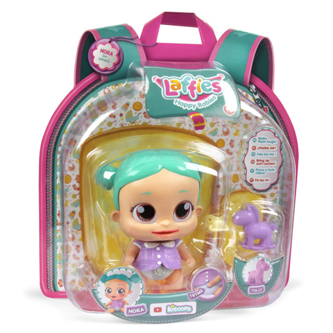 Nora a Laffies egy interaktív babája, aki csak arra vár, hogy gyermekeddel együtt játszhasson és mókázhasson. Nora kék kontyos hajat kapott, nagy barna szemekkel, lila ruhácskával és pelenkával. Nora különleges kialakítást kapott, aminek köszönhetően a megfelelő helyen megcsiklandozva kacagni kezd, akárcsak egy igazi kisbaba. Ha viszont rossz helyen csikizzük akkor kifejezi nem tetszését is. Nora kedvenc játékával és egy cumival érkezik, melyekkel még jobb lehet a játék. Szerezd be és keresd más változatban is. Kiváló minőségének köszönhetően sokáig lehet majd használatban, ráadásul több babával játszva reagálnak is egymás hangjára.