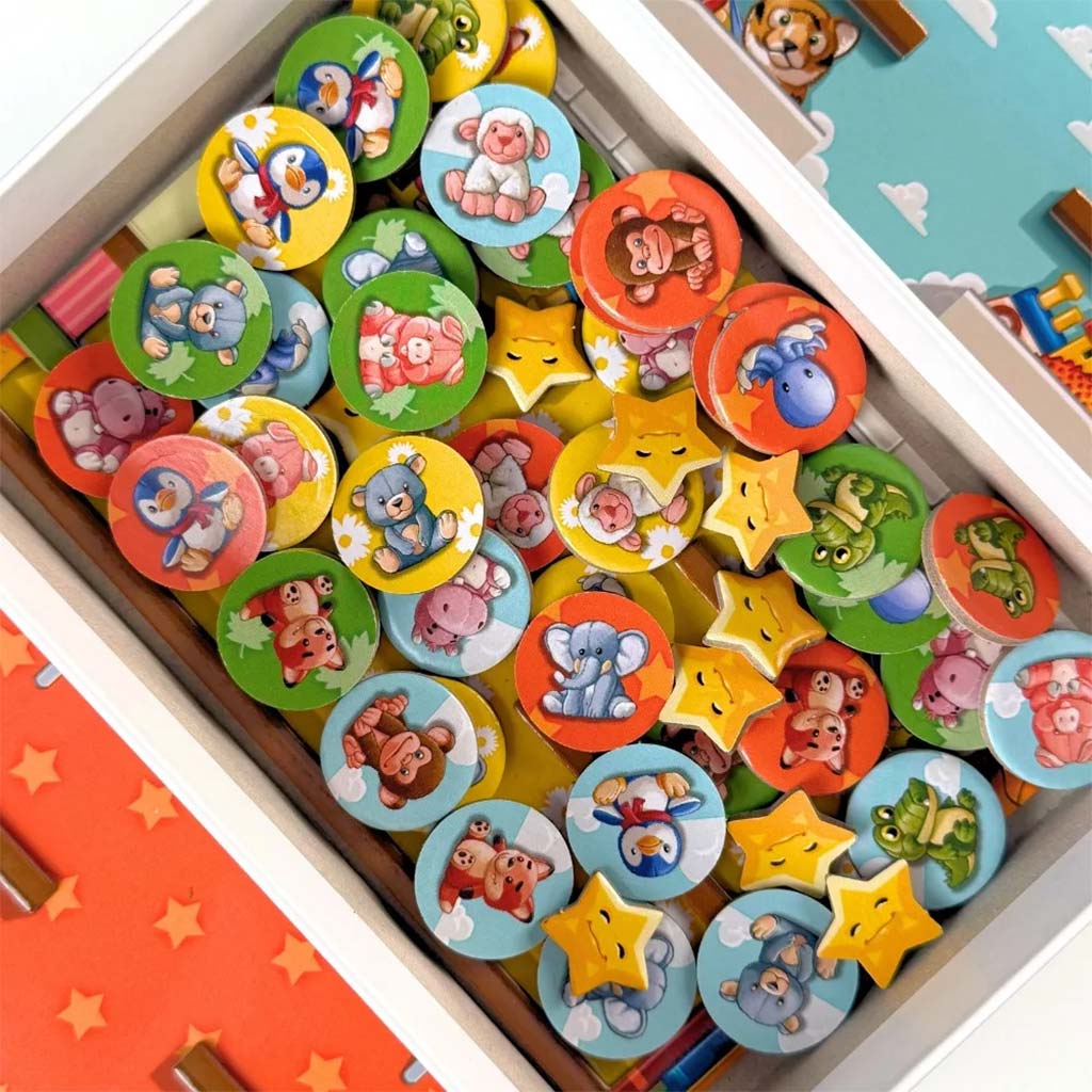 - A doboz tartalma: 40 plüssjátékot ábrázoló korong (10-10 játékosonként), 4 hálószobatábla (1-1 játékosonként), 24 célkártya (Könnyű mód az egyik oldalán, nehéz mód a másikon), 9 csillag