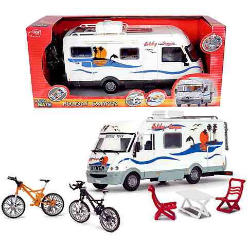 A lakókocsi minden szükséges kellékkel fel van szerelve, így az egész családnak szórakoztató kikapcsolódásban lesz része. Az 1/18-as méretarányú lakóautóhoz kerékpárok is tartoznak, így a játék még érdekesebb lesz. Nyisd ki az ajtókat, vagy vedd le az autó tetejét, hogy a belső, kidolgozott térben is játszhass.