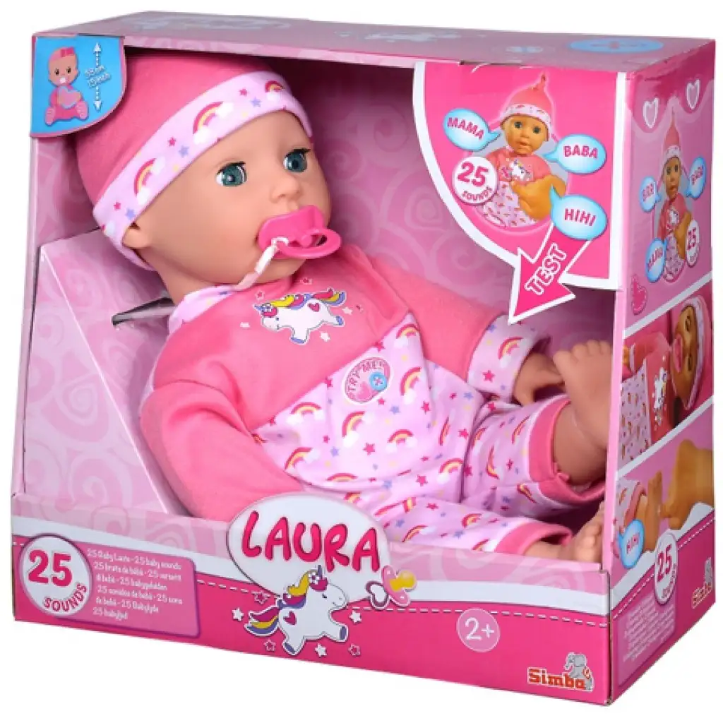 A babázás már évezredek óta nagy szerepet tölt be a gyermekek életében, hiszen ezekkel a játék során rengeteget fejlődhetnek személyiségben. Most egy különleges hangot adó babát szerezhetsz be kislányodnak, aki nem más mint Laura. A baba szemhéja mozgó, így lefektetve lecsukja szemeit. A hozzá tartozó cumival gyermeked bármikor megnyugtathatja a kisbabát, aki 25 különböző baba hangokat tud hallatni. Ezzel a játék élmény még jobb lehet majd, és bárhova magával viheti majd gyermeked.