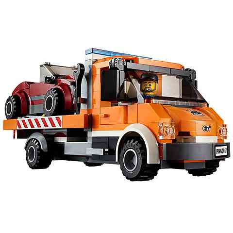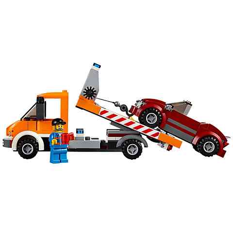 Az üzletasszony nem tud munkába igyekezni, hiszen lerobbant a kocsija! Hívd a Lego City autószerelőt a platós vontatójával, hogy megjavítsa. Ha valamiért mégsem sikerül neki a helyszínen megcsinálni, a csörlő használatával tedd a platóra és vontasd el a legközelebbi szerelőműhelybe. Mentsd meg a napot a lapos platós vontatóval!