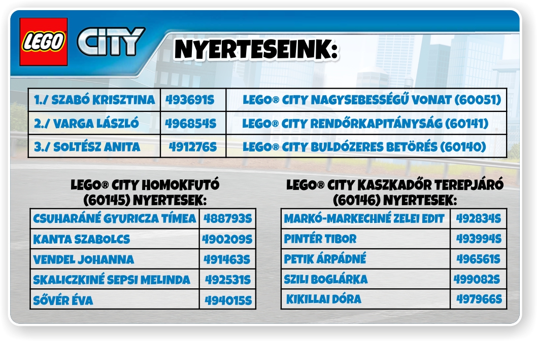 Lezártuk a LEGO® City nyereményjátékot, melyben kisorsolásra kerültek a nyertesek. Köszönjük, hogy ezúttal is ilyen sokan regisztráltatok a játékra!
