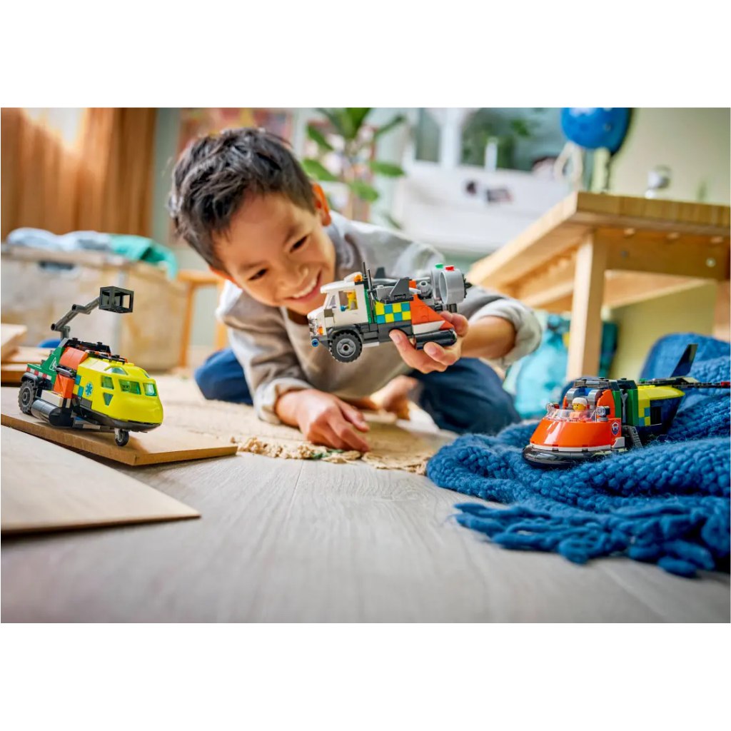 • 3 MENTŐJÁRMŰJÁTÉK 1 KÉSZLETBEN – A LEGO® City Repülőgép, emelőkosaras kocsi és légpárnás jármű remix (60505) készlet egy fantáziadús szett 3 kombinálható mentőjárművel, 7 éves kortól.