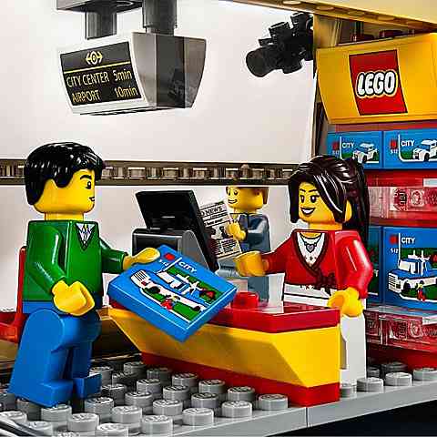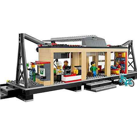 Érkezz taxival a Lego City városi vasútállomásra, ahol sohasem áll meg az élet! Menj fel a lépcsőn, keresztül a nyitható ajtókon, majd szerezz információkat a vonat érkezési idejéről és indulási helyéről. Amíg a vonatra várakozol a boltokban vásárolhatsz, esetleg pénzt vehetsz fel a közeli ATM automatából. Ezután helyet foglalhatsz a peronnál, és akár egy finom croissant-t is elfogyaszthatsz.