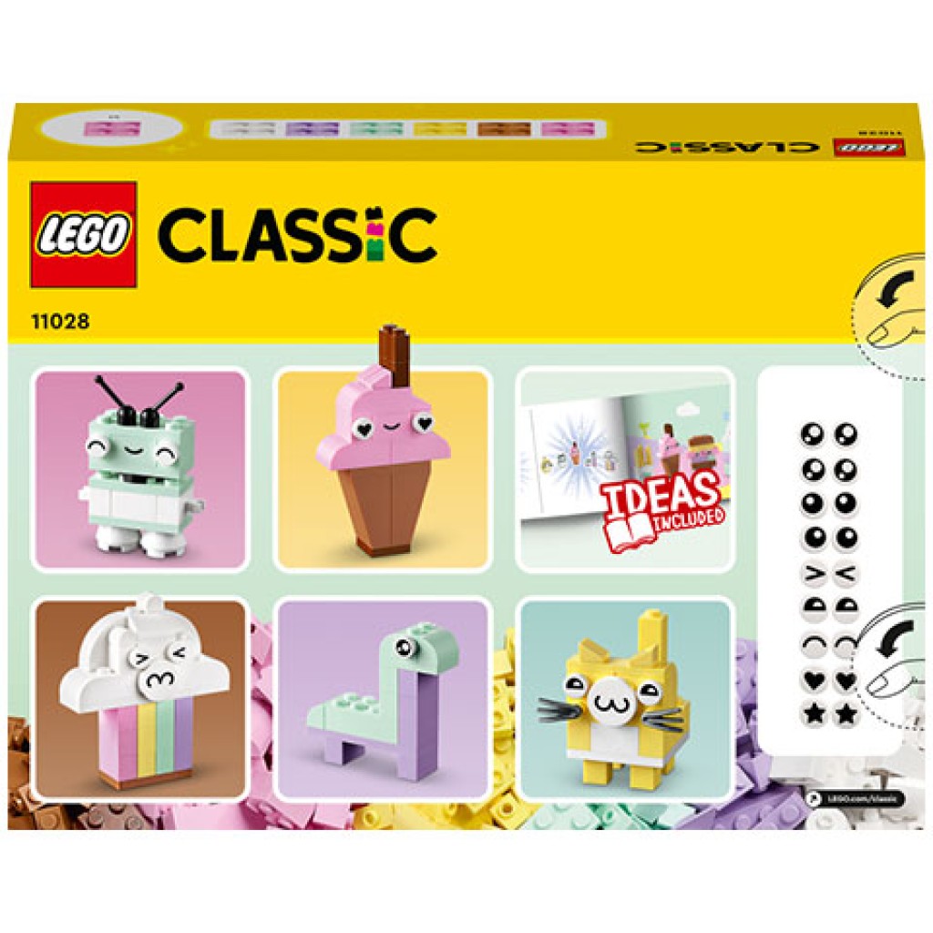 Ez a kreatív építőkészlet 333 elemet tartalmaz különböző formákban, méretekben és pasztellszínekben. A kockák közül 18 darab kifejező szemekkel van ellátva, így a gyerekek életrekelthetik az alkotásaikat. Az 5 könnyen megépíthető modellhez nyomtatott építési útmutatók tartoznak: felhő, fagylalt, dinoszaurusz, macska és robot. A gyerekek az egyre növekvő, kreatív önbizalmukkal felfedezhetik a szabad építési szórakozást is. A készlet építési útmutatóinak digitális változatát a LEGO Builder appban találod.