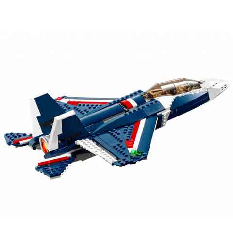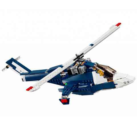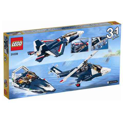 Dübörögj a föld és a víz fölött a 3 az 1-ben LEGO® Creator Kék vadászrepülőjével! Ez a lenyűgöző modell sötétkék, fehér és piros színmintákat hordoz és egy sereg izgalmas tulajdonsággal rendelkezik, ilyen például a mozgatható szárny, magassági kormány és csűrőkormány, behúzható futómű és egy nyitható motorház. Valósághű részletek, például kettős függőleges stabilizátorok, nagy színezett pilótafülke, félkör alakú szívónyílások, navigációs fények, és hatalmas kipufogó teszi élvezetessé ennek a modellnek az építését és a vele való játékot. Ha új kihívással szeretnél szembenézni, építsd át vagány, csúcstechnikai helikopterré vagy szuper, áramvonalas, iker pilótakabinnal felszerelt légpárnás járművé. Mindezt egyetlen építőelem készletből... ez ám az igazi 3 az 1-ben készlet!