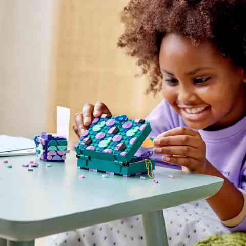 A LEGO Dots egy különleges szettjét szerezheted be gyermekednek, amivel egy saját dobozt építhet meg. A LEGO építőelemek egy műanyag tároló dobozban érkeznek, melyben külön válogatva találhatóak meg a díszítő és építő elemek. Ezeket többféle módon is lehet variálni, így egyedi dobozkákat létrehozva, melyeket aztán saját elképzelése szerint lehet variálni, a dobozt pedig a kulcs segítségével pedig zárni is lehet. A gyermekek más LEGO dots készletek és csomagok csempéit is felhasználhatják, például az Extra DOTS – 3. sorozatból, melyet megtalálsz kínálatunkban is, hogy kibővítsék az ötleteiket!