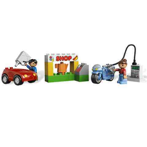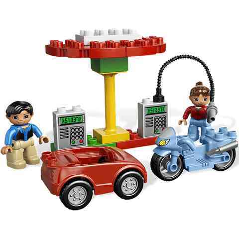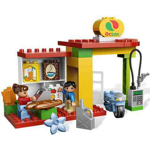 - A készlet része: 2 üzemanyagpumpa, olajos kanna, virágok, pénztárgép, pihenő wc-vel, Duplo elemek.
