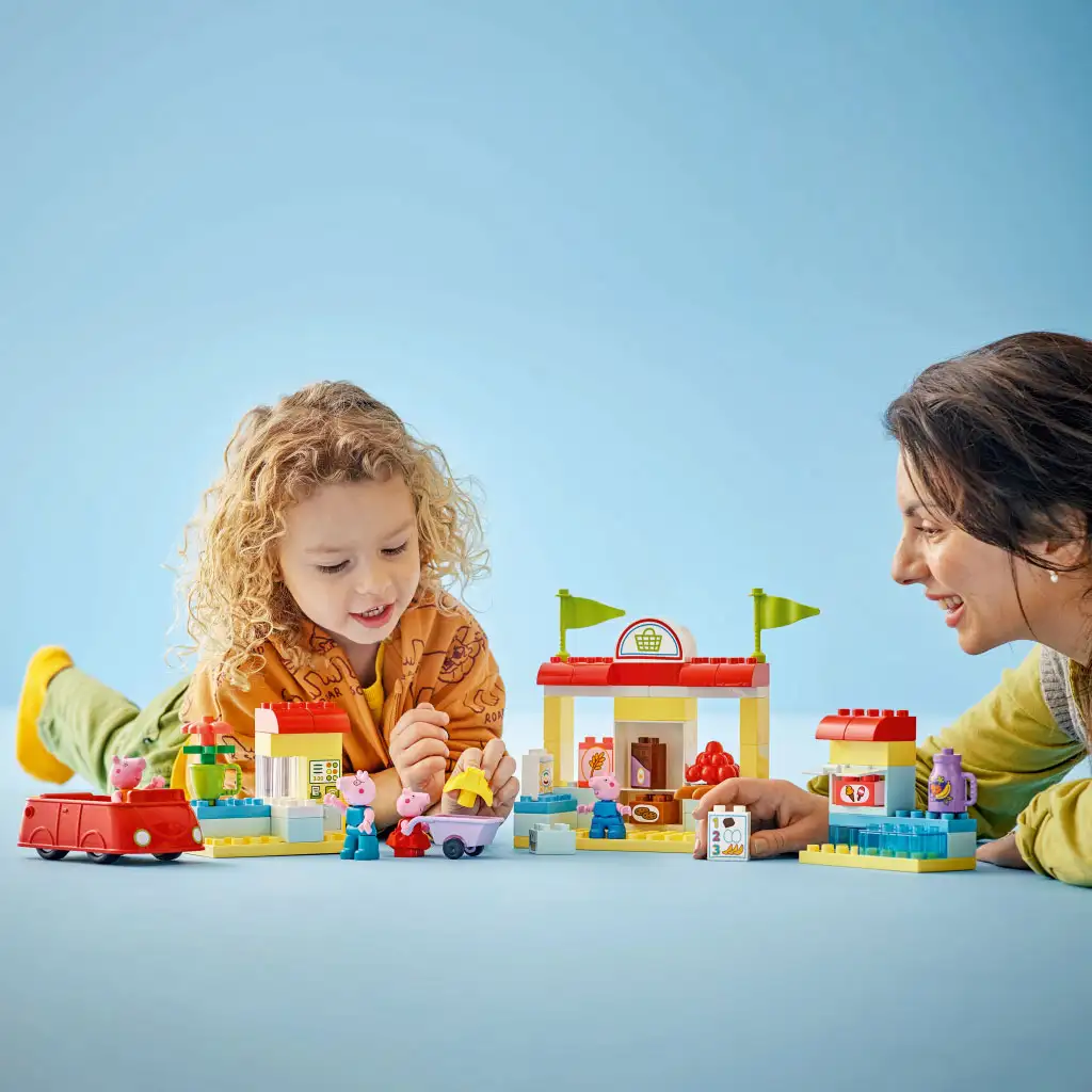 Ez a LEGO DUPLO Peppa malac óvodásoknak szóló tanulójáték segít fejleszteni a készségeiket, például logikusan kell gondolkodniuk, miközben eljátsszák a tévéműsor által inspirált bevásárlóutakat. A családok az érzéseiket is felfedezhetik a játék során. Ez a hétköznapi jelenet megindítja a beszélgetést a felnőttek és a kicsik közt arról, hogyan kell viselkedni a boltban, és ami a legfontosabb, hogy ki tolja a kocsit!