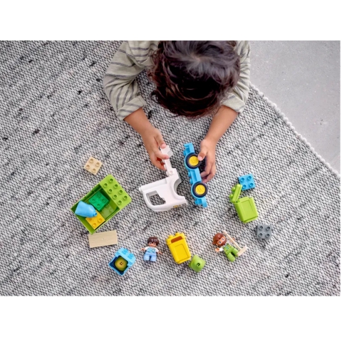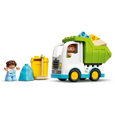 • Tartalmaz 2 DUPLO® figurát – egy újrahasznosítással foglalkozó férfit és egy fiút –, egy mozgatható teherautót billenő funkcióval, 3 zsákot, amelyek beleférnek a 3 hozzájuk tartozó kukába, valamint egy nagy seprűt is.