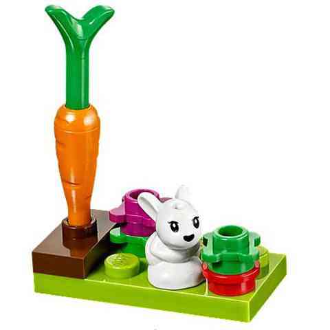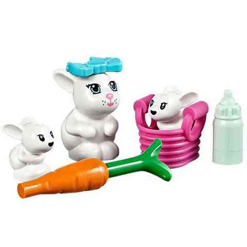 Vigyázz a nyuszi mamára és az ő picinyeikre! Ez a nyuszis játszó szett ideális lehet a kisállatkedvelők gyerekeke számára. A kertben a nyuszi mama 2 kis porontyot szült. Segíts neki megitatni őket a cumisüvegből, adj nekik friss sárgarépát, valamint retket a veteményesből, hogy szépek nagyok és erősek legyenek. Építs nekik egy kis rejtekhelyet ahol elbújhatnak a kíváncsi szemek elől, vagy felmászhatnak a kis rámpán. A készlet ideális kiegészítője lehet a 41085 -ös szett.