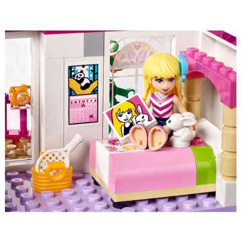 Üdvözlünk Stephanie csodálatos házában, mely fantasztikus játékélményt tartogat a számodra! A szettből összeépíthető a ház, mely két emeleten vár izgalmas helyszínekkel. A földszinten megtalálható a tágas konyha étkezővel és konyhai gépekkel, az előszoba, valamint a nappali TV-vel és kanapéval. Az emeletre érve megpillanthatod a dolgozószobát és a tágas hálószobát. Az épület középen szétnyitható, hogy játék közben jobban hozzáférj. A szett egy nyuszi kifutót is tartalmaz, melyhez egy nyuszi figura tartozik. A készletben 3 db LEGO Friends figura található.