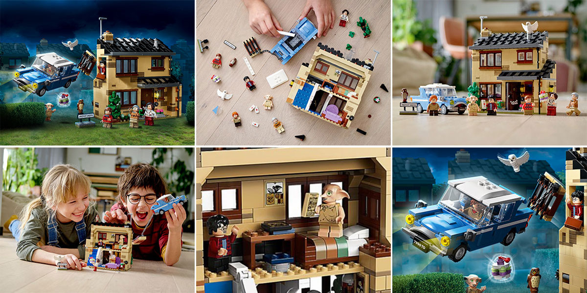 • A LEGO Harry Potter Privet Drive 4. készlet rengeteg izgalmas filmjelenetet felelevenít, többek között Harry lépcső alatti gardróbját, a kandallóból özönlő leveleket és Harry szökését a repülő Ford Angliával.
