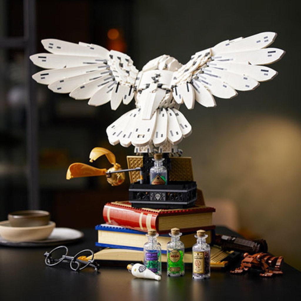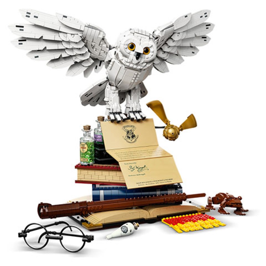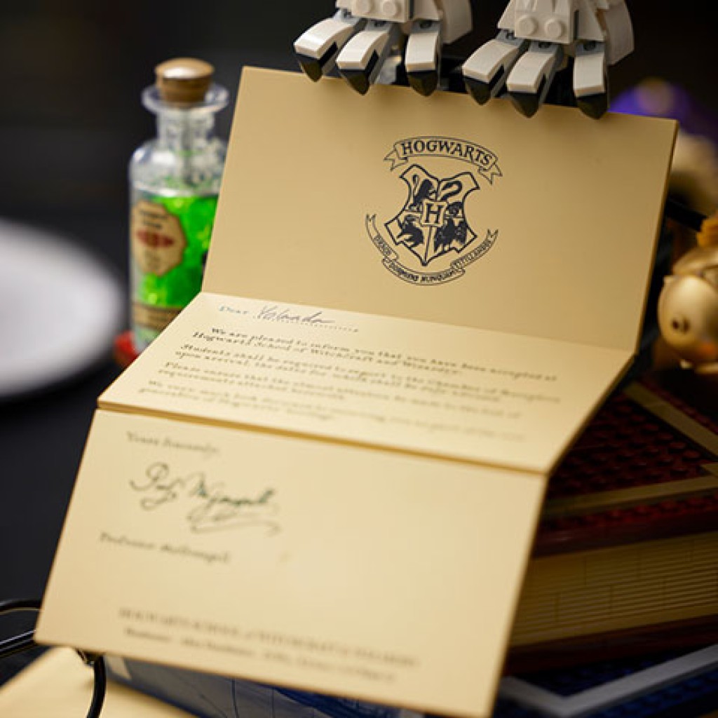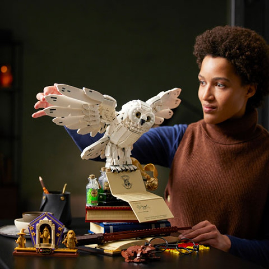 A Harry Potter varázsvilága előtt hódoló készlet számos ikonikus emléktárgyat tartalmaz egyetlen bámulatos modellben. Megtalálod Harry pálcáját és szemüvegét, Ron csokibékáját, Hermione bájitalos tálcáját, rajta 5 üveg bájitallal és varázslatos összetevőkkel (köztük varangydudvával, Felix Felicis „folyékony szerencse” bájitallal és százfűlé-főzettel), Tom Denem naplóját, az aranycikeszt, valamint egy iskolai sálat is (ami bármelyik roxforti házhoz alakítható). Az elbűvölő építmény tetején Hedvig ül, miközben egy áhítozott roxforti meghívót tart magánál. Ez a bámulatos modell 3 exkluzív aranyszínű minifigurát is tartalmaz – Albus Dumbledore™-t, Minerva McGalagony™-t és Rubeus Hagrid™-ot –, valamint egy díszített csempével ellátott bemutatóállványt a LEGO Harry Potter elmúlt 20 évének megünnepléséhez.