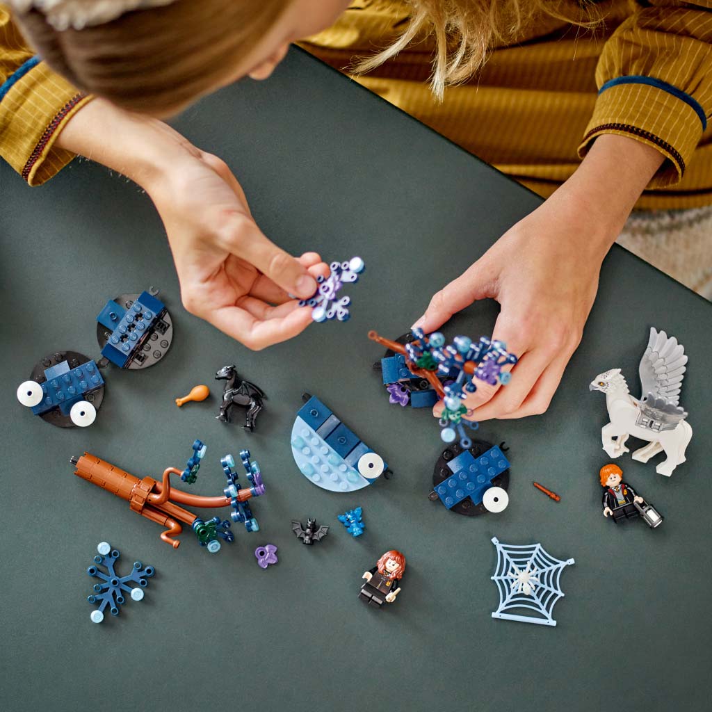 • 2 LEGO® minifigurát tartalmaz – Ron Weasley™ és Hermione Granger™, plusz egy Csikócsőr™ játékfigura beállítható fejjel és szárnnyal, egy bébi thesztrál figura és egy tündérmanó-figura