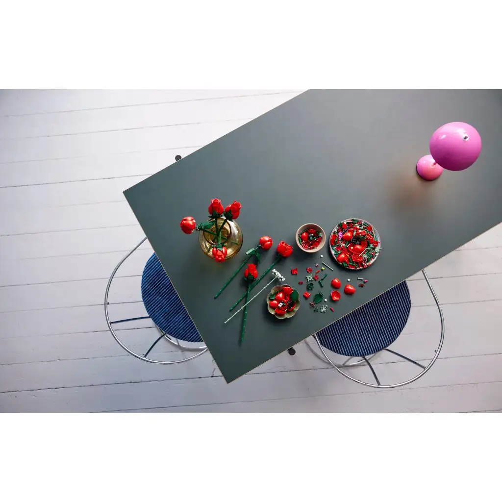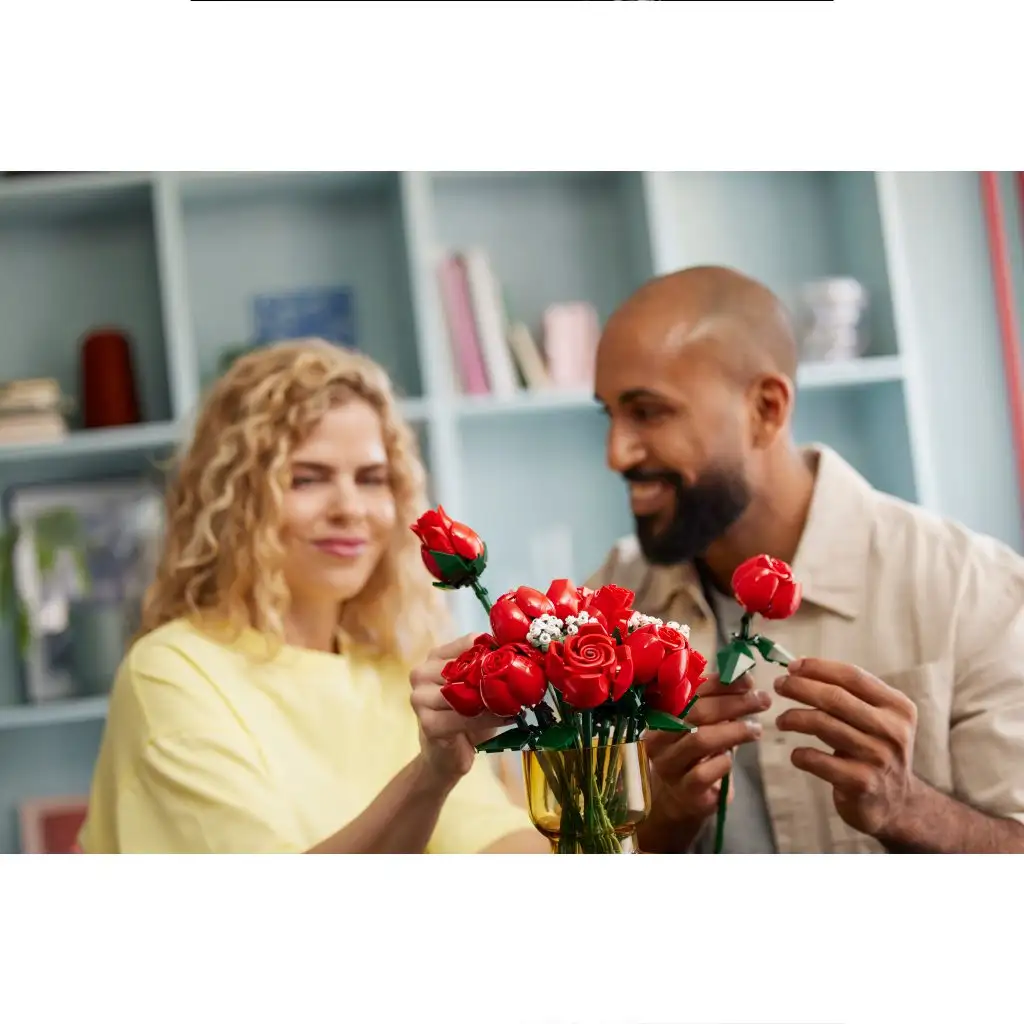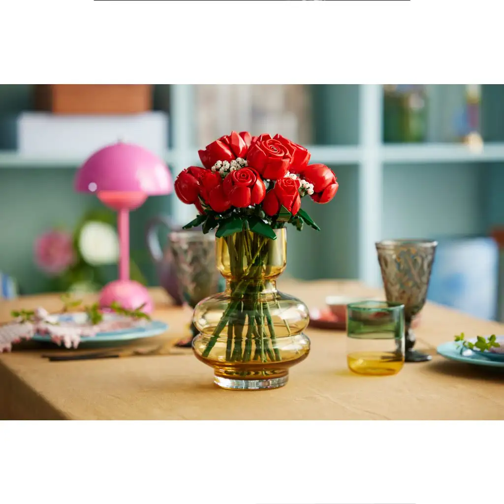 Az örömteli építést nyújtó LEGO csokor egy tucat rózsából áll, közülük 4 bimbóban van, 4 félig, 4 pedig teljesen kinyílt. Hosszú száraikkal kiállíthatók a vázában, és még 4 szál fátyolvirág is tartozik hozzá apró, fehér virágokkal. A csokor könnyen megépíthető, és kiállítva bárhol elegáns dísz lehet, továbbá kombinálható a LEGO Botanikai gyűjtemény többi készletével is.