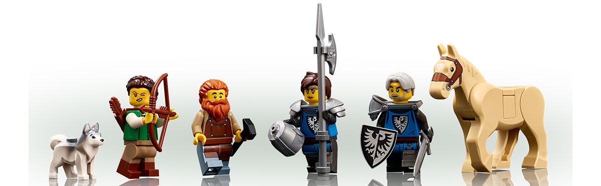 • A csomagban 4 minifigurát találsz: egy kovácsot, egy íjászt és 2 Fekete Sólyom lovagot 4 karddal, 3 pajzzsal és egy alabárddal. Emellett vár rád egy állítható lófigura megépíthető szekérrel, valamint egy kutya- és egy levelibéka-figura is.