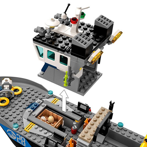 • A csónakban találsz egy irányítótermet, amit ha leveszel, könnyen hozzáférhetsz a raktérhez, továbbá egy dinoszauruszketrecet és egy forgatható „keresőfényt”. A készlet emellett egy kis motorcsónakot is tartalmaz, ami lebeg a vízen.