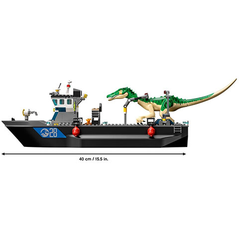 A gyermekek a víz felszínén vághatnak bele a LEGO Jurassic World akcióba ezzel a Baryonyx dinoszaurusz szökés csónakon játékkészlettel. Ez a legelső LEGO Jurassic World készlet, ami csónakokat tartalmaz. Találsz benne egy kockákból épült csónakot, ami még akkor is lebeg a vízen, amikor a beállítható Baryonyx dinoszauruszfigurát szállítja. A csónak tartalmaz egy dinoszauruszketrecet, egy forgatható „keresőfényt” és egy irányítótermet, amit ha leveszel, hozzáférhetsz a raktérhez.