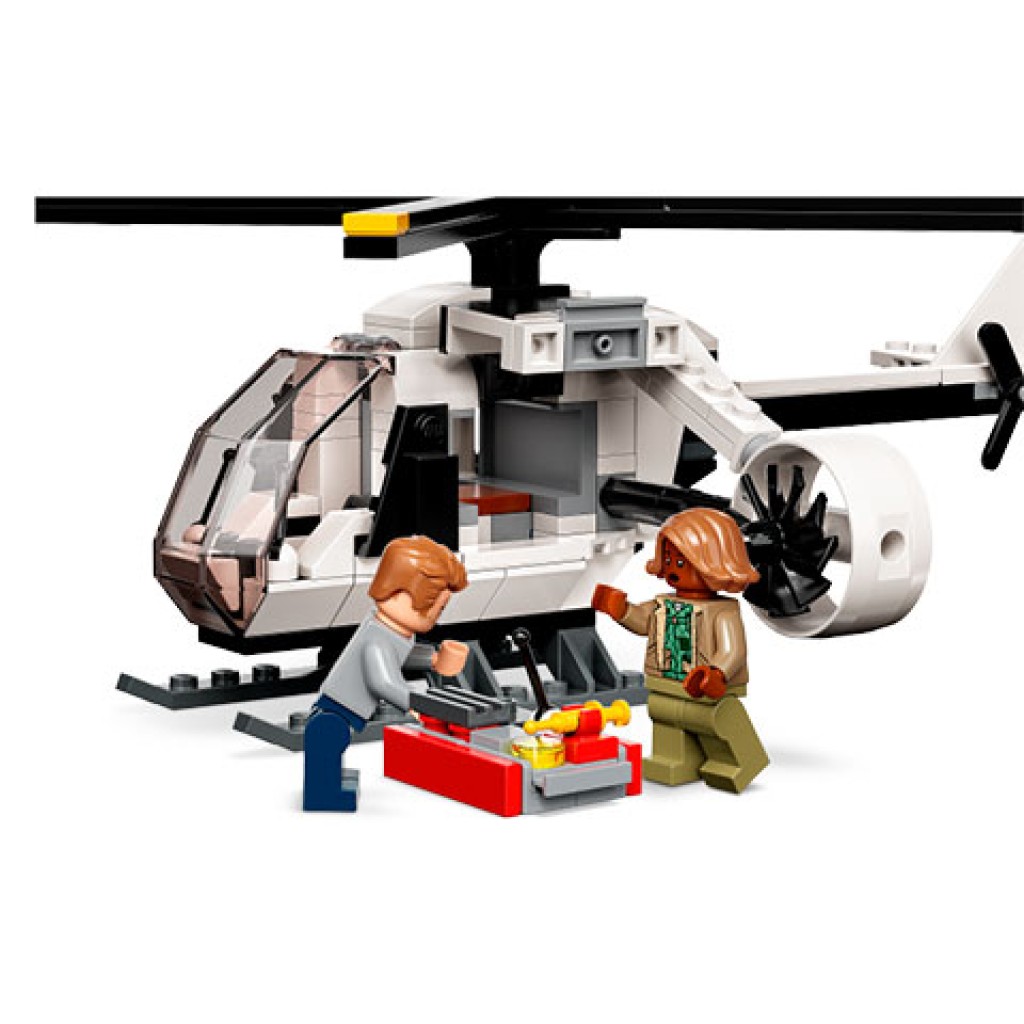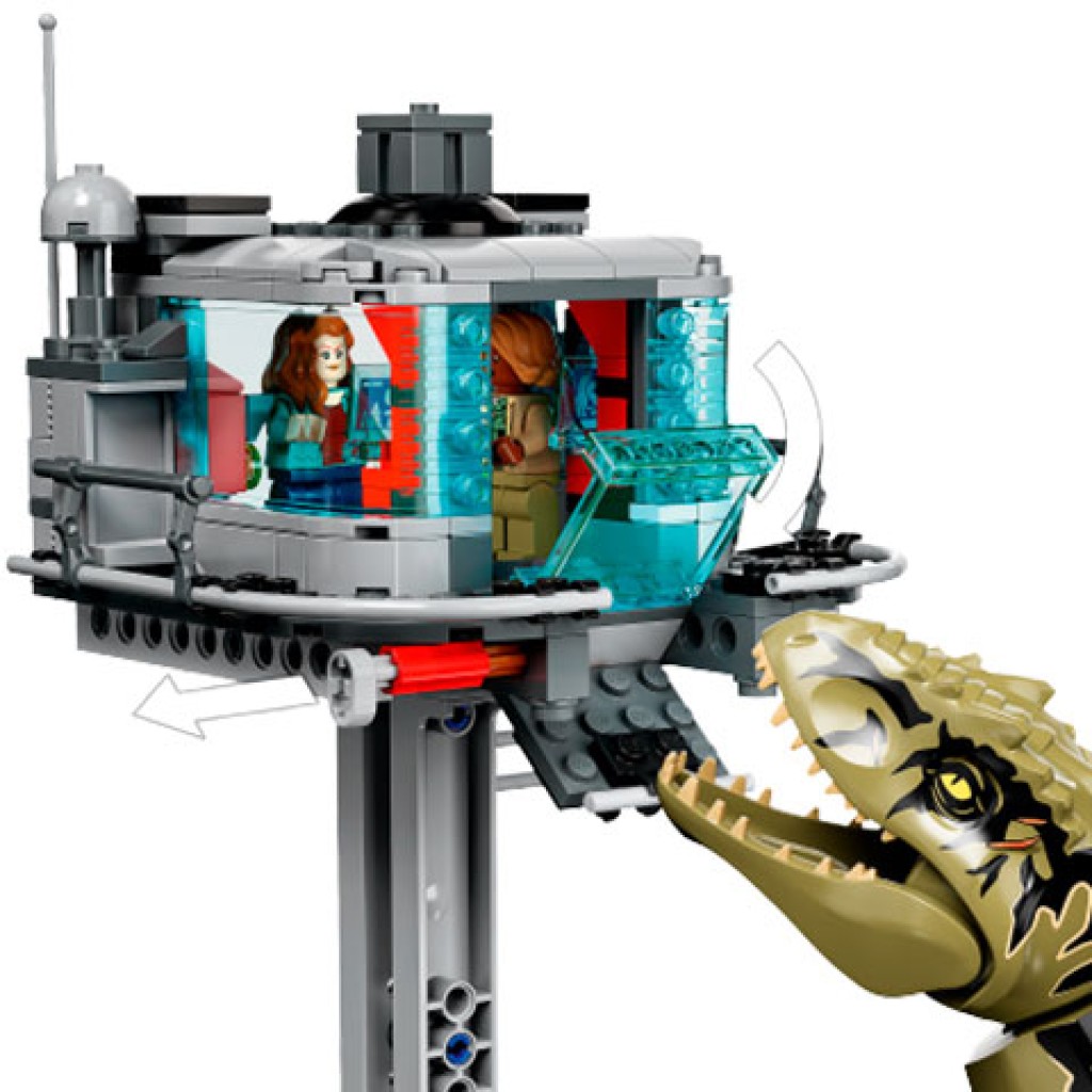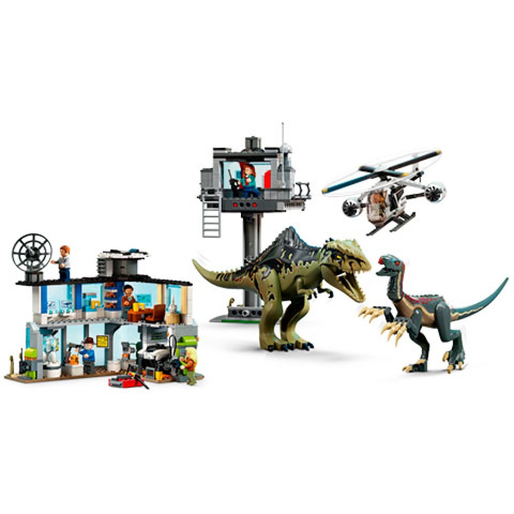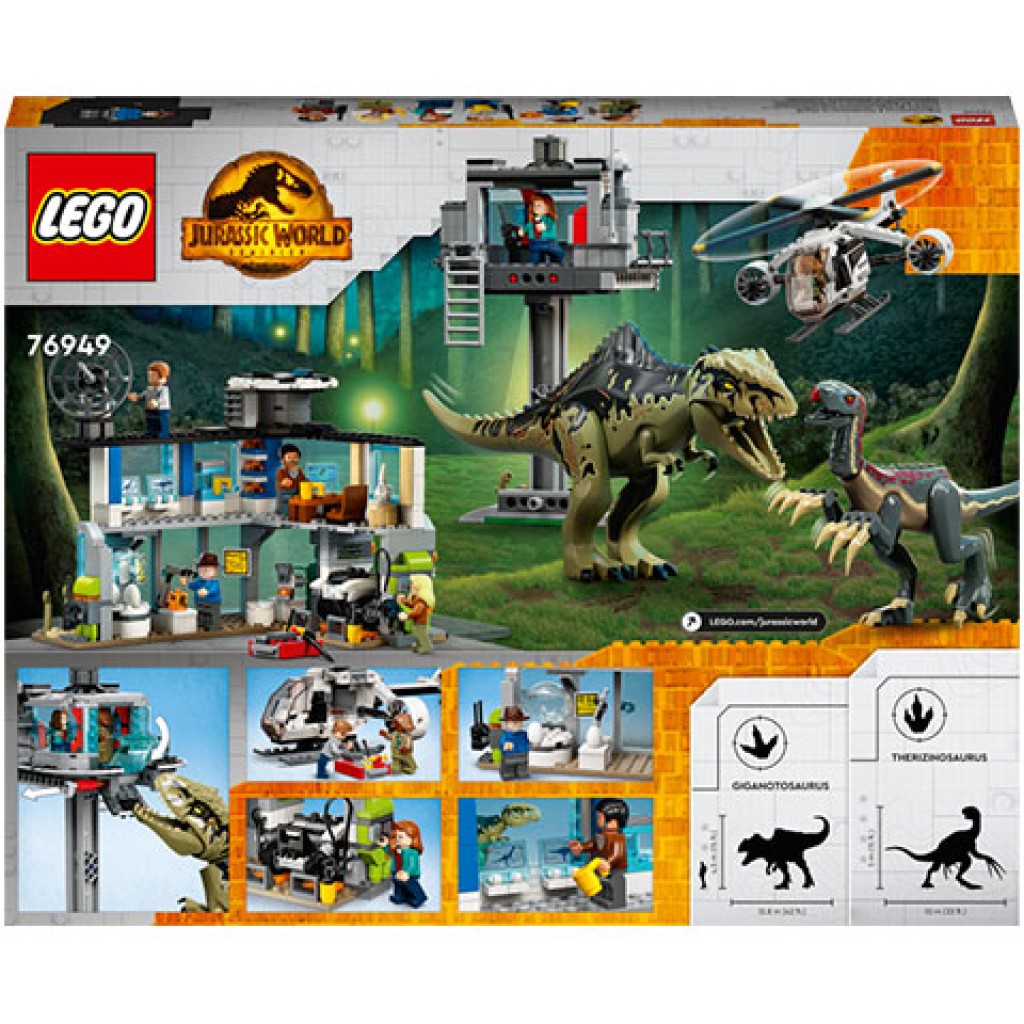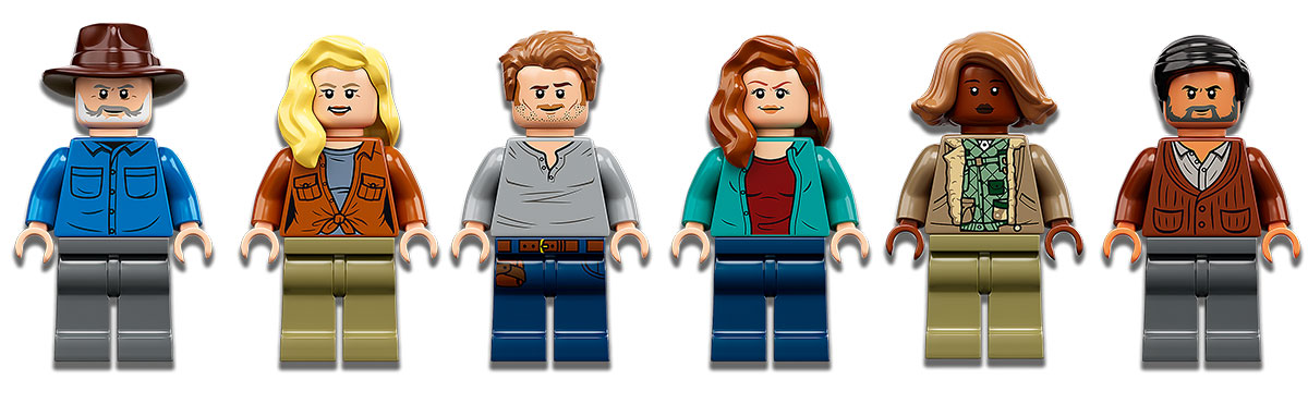 • 6 minifigura – Owen Grady, Claire Dearing, Dr. Alan Grant, Dr. Ellie Sattler, Kayla Watts és Dr. Henry Wu, valamint egy beállítható, több mint 32 cm hosszú Giganotosaurus és egy therizinosaurus