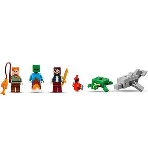 - A szett része a LEGO® Minecraft™ minifigura: kalóz és Alex, valamint egy zombi, delfin papagáj és teknős figurák