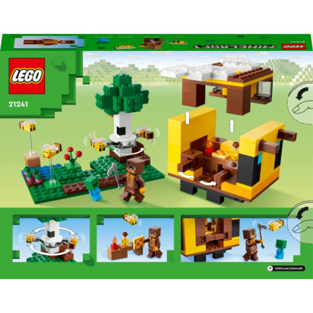 A játékosok a kreatív Minecraft építési készségeikkel egy méhecske formájú házikót építhetnek. A levehető tetőnek köszönhetően könnyen hozzáférhetnek a belsejéhez is. Kívül találnak egy mézzel ellátott méhkast, növényeket, amiket a farmon termeszthetnek és ellenséges mobokat, amikkel megküzdhetnek. A készlet egy medve játékos karaktert, egy zombibabát, 3 méhet és 1 dühös méhet tartalmaz. Emellett egy pöccintéssel beindíthatod a 2 méhet, hogy a fa körül repkedjenek. A gyerekekre digitális móka is vár, hiszen a LEGO Builder app intuitív nagyító és forgató eszközeivel építés közben megjeleníthetik a modelljük képét.