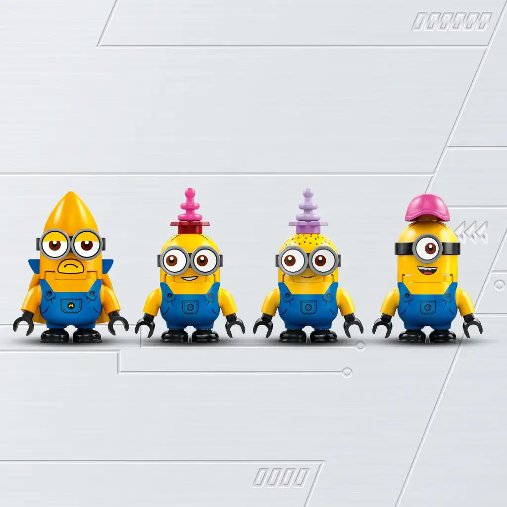 • Játék busz minyonokkal – Tartalmaz egy megépíthető, tologatható buszt, amely egy mobil bulihelyiséggé változik a 4 LEGO® minyonfigura számára: Phil, Mel, Dave, és a magasan repülő, mega minyon, Guszti