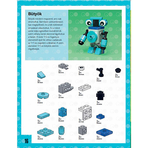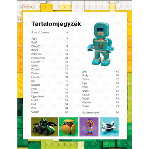 A 96 oldalas építési útmutató könyv segítségével LEGO robotokat készíthet el gyermeked saját kezűleg az otthon található LEGO elemek felhasználásával. A könyvben összesen 30 különböző robot modell összeszerelési útmutatóját találhatod meg és a tartalomjegyzékből kiderül, hogy a robotok milyen fantázianévvel rendelkeznek. Kínálatunkban további LEGO útmutatós könyveket is megtalálhatsz, amelyek segítségével további kreatív ötleteket meríthet gyermeked a legózáshoz.