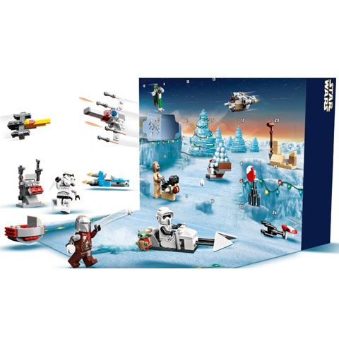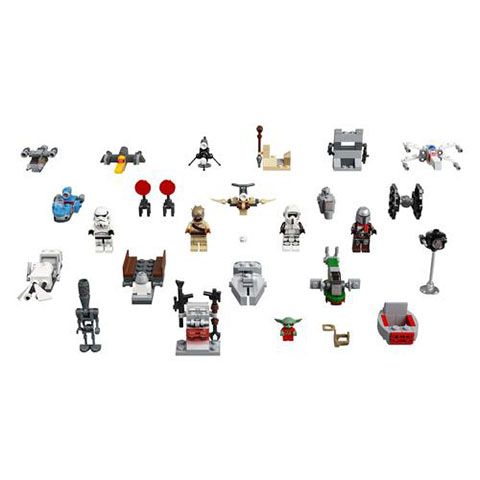 Ebben az ünnepi naptárban 7 LEGO minifigurát/figurát/droidot találsz: az ünnepi ruhába bújt Mandalórit és A Gyermeket (Grogut), akit sokan Baby Yodának becéznek, valamint egy Felderítő rohamosztagost, egy Rohamosztagost, egy Buckalakót, IG-11-et és IT-O vallató droidot. A gyermekek a miniépítményeket is örömmel fogják megépíteni a játékhoz, köztük A Razor Crestet, egy TIE vadászgépet, egy Buckalakó hógolyó-hajítógépet, gyakorló céltáblákat és A Gyermek lebegő babakocsiját.